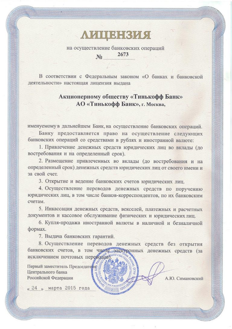 АО «Тинькофф Банк», Лицензия Банка России на осуществление банковских операций № 2673, сайт https://www.tinkoff.ru/